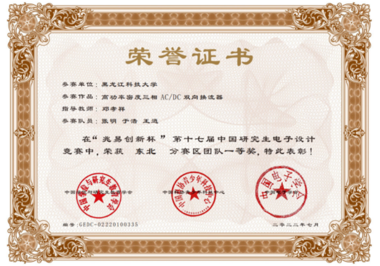 近日,由教育部学位管理与研究生教育司指导,中国学位与研究生教育学会、中国科协青少年科技中心、中国电子学会共同主办的“兆易创新杯”第十七届中国研究生电子设计竞赛全国总决赛成功举办。公司邓孝祥教授指导的队伍(张明,于浩,王逍)以“高效高密V2G系统”作品荣获东北赛区一等奖,并在国赛中获得了国家三等奖的成绩。本次比赛共有来自全国200余所高校及科研院所的5800多支队伍报名参赛,分八大分赛区进行比赛。中国研究生电子设计竞赛是面向全国在读研究生的一项团体性电子设计创新创意实践活动,也是“中国研究生创新实践系列大赛”主题赛事之一。公司同时获得东北赛区优秀组织单位,邓孝祥教授获得东北赛区优秀指导老师称号。