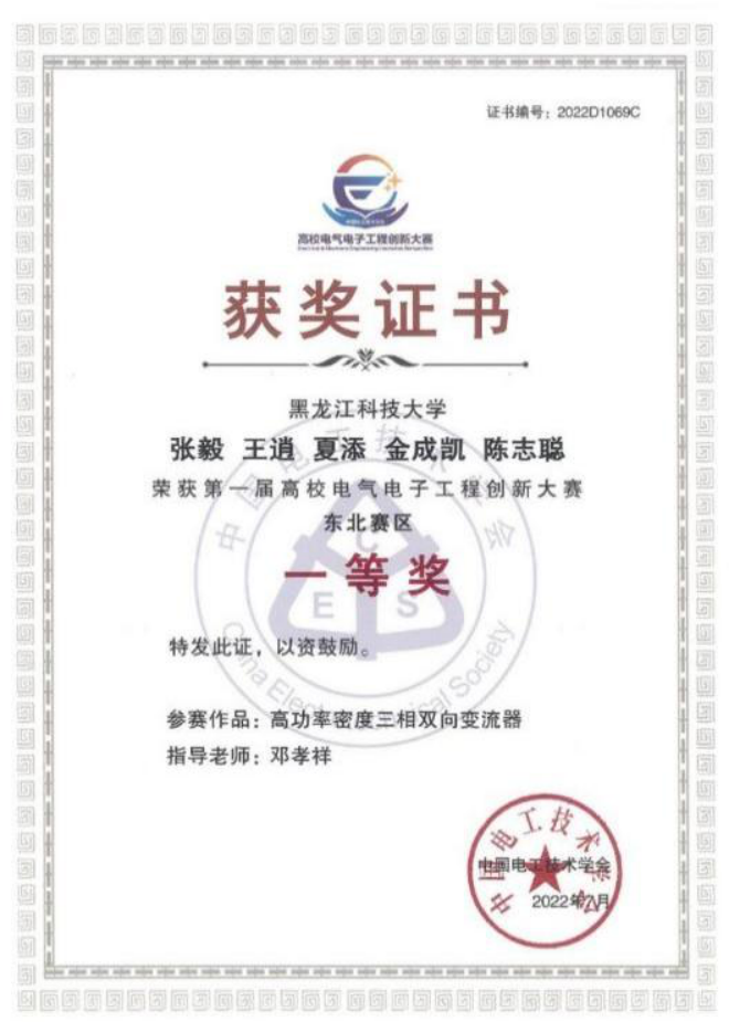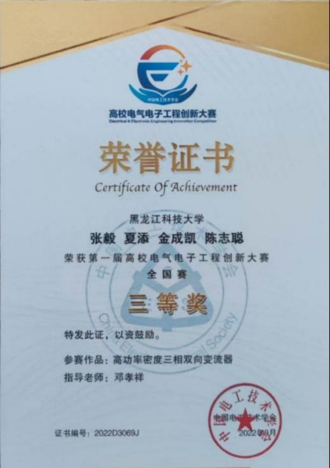 近日,由中国电工技术学会主办,教育部高等公司电气专业教学指导委员会指导,清华大学承办,施耐德电气(中国)有限公司独家冠名举办的“第一届高校电气电子工程创新大赛”吸引了包括全国59所高校的1000余支队伍报名参赛。经过近2个月的精心准备、激烈角逐,公司邓孝祥教授指导的队伍(张毅,王逍,夏添,金成凯、陈志聪),以“高功率密度三相双向变流器”作品荣获东北赛区一等奖,成功晋级复赛,并最终获得获得“第一届高校电气电子工程创新大赛”全国三等奖。