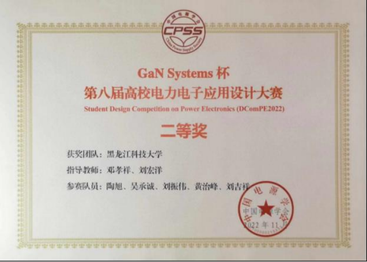 近日,由中国电源学会主办,合肥工业大学承办的“GaN Systems”杯第八届高校电力电子应用设计大赛决赛在厦门市成功举办,共吸引了来自华中科技大学、浙江大学、西安交通大学、北京交通大学、东南大学等46所高校积极报名参赛。最终包括公司在内的16支参赛队伍进入决赛。由公司邓孝祥教授和刘宏洋副教授指导的队伍(吴承诚、陶旭、刘振伟、黄治峰、刘吉祥),成功杀入决赛,并成为东北三省唯一一所晋级决赛的高校,并最终荣获大赛二等奖。