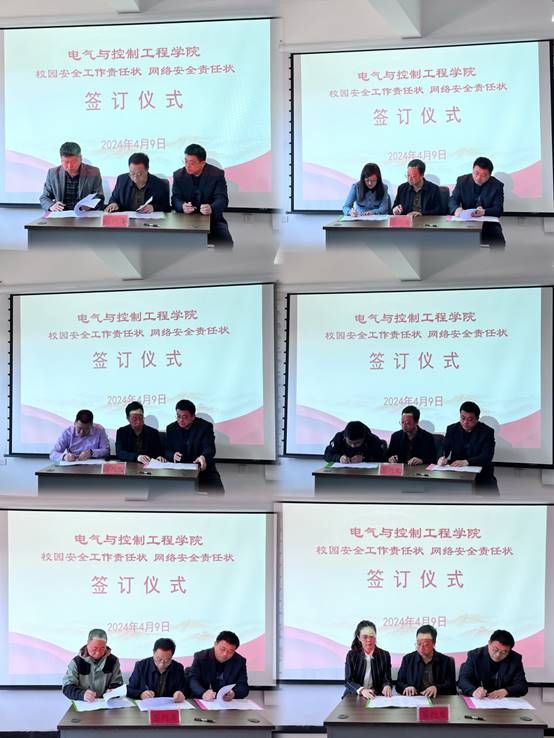 会上公司党委书记李鹏银、经理苏勋文分别与公司党委副书记侯树成、副经理刘丹丹、李忠勤,副处级辅导员韩大伟、各部门签订校园安全责任状和网络安全责任状。会后,各位副处级领导与分管的部门签订了校园安全工作责任状和网络安全责任状。